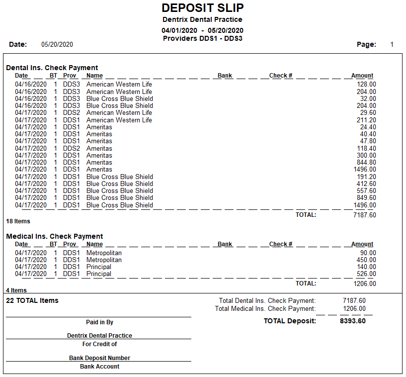 Deposit Slip - Select to print payment transactions in a format suitable for a bank deposit slip, and then click Options to select the payment types that you want to include on the deposit slip.