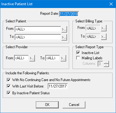 The Inactive Patient List is a list of inactive patients according to options you select: No Continuing Care Date, No Future Appointments, Last Visit Date, and Inactive Patient Status.