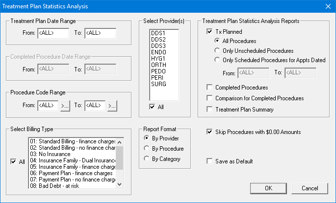 · Treatment Plan Date Range - Type a date range for treatment-planned procedures in the From and To fields. Or, leave <ALL> entered in both fields to include treatment-planned procedures for all dates.