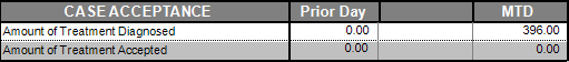 The Amount of Treatment Accepted is the sum of the following for the current month and selected dentists and hygienists: