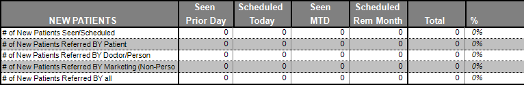Seen Prior Day - The # of New Patients Seen for the Prior Day. Each patient must have a First Visit Date that is the same as the Prior Day.