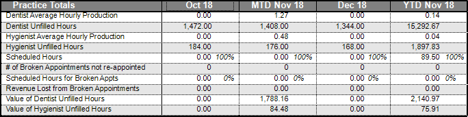 YTD - The Value of Dentist Unfilled Hours since the beginning of the year. The percentage (%) in this box is the Value of Dentist Unfilled Hours since the beginning of the year (fiscal or calendar) divided by the Value of Total Unfilled Hours since the beginning of the year.
