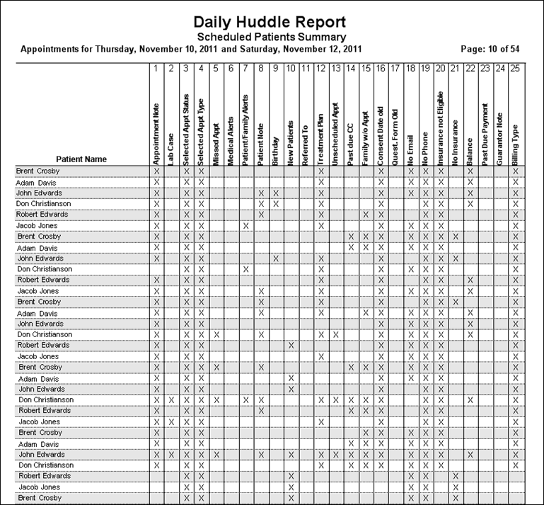 If Scheduled Patient Summary was selected when setting up options for the report in the Daily Huddle Report dialog box, the report will include an extra page(s) with certain statistics for each scheduled patient. Each column of this summary is displayed according to the selected options under Select Report Sections & Order in the Scheduled Patients Setup dialog box. Also, patients are listed in the summary according to the criteria specified in the Scheduled Patients Setup dialog box and according to the state of the Include All Scheduled Patients check box in the Daily Huddle Report dialog box.