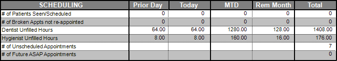 The Dentist Unfilled Hours is the difference of the # of Dentist Production Days (in minutes) and the Scheduled Time for a given date or within a date range for selected dentists. Events scheduled in the Appointment Book are not taken into consideration (for example, if all operatories have been blocked off for an entire day, those hours will still show up on the report as part of the unfilled hours unless a provider's schedule setup changes) Also, inactive dentists are not counted.