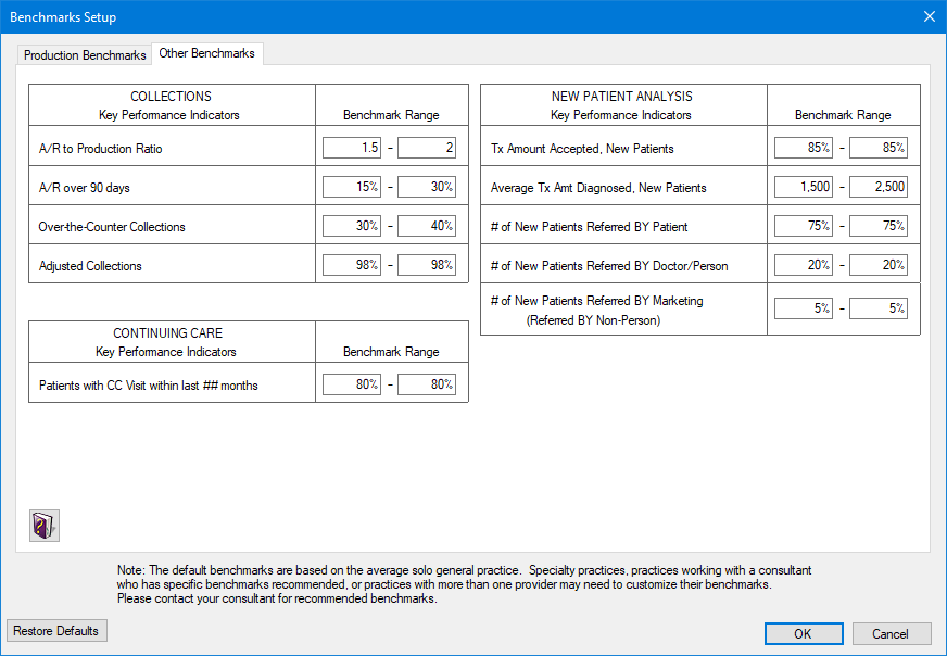 The Practice Advisor comes installed with industry-standard benchmarks from top dental consultants. You may use these default benchmarks or change them to meet your practice goals.