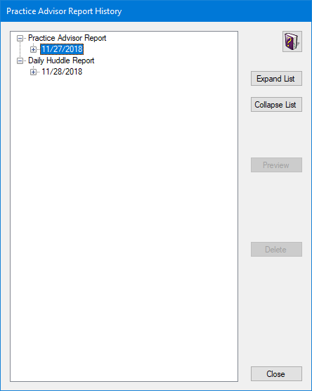 Practice Advisor Reports and Daily Huddle Reports are grouped by date and then listed by the time each was generated.