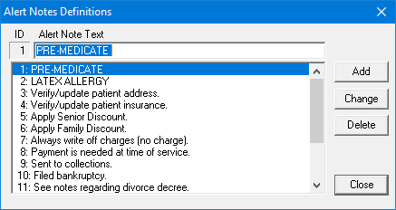 Dentrix includes a list of 17 pre-defined alert notes. You can create your own alert notes. You can also delete any alert notes regardless of whether you created them or not. You can use alert notes to remind you of pre-existing medical conditions, discounts, account issues, and so on.