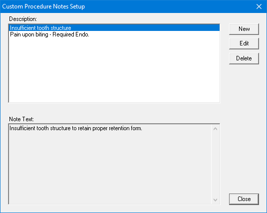 You can set up a library of custom notes in Dentrix. These notes serve as templates that you can draw from. You can use the text of any note without changing it or customize it as needed, depending on the situation for which you are adding a note.