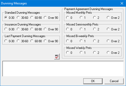 Under Standard Dunning Messages, Insurance Dunning Messages, and Last Payment Dunning Messages, select the option that corresponds to the age bracket for which you want to add, edit, or delete a dunning message.