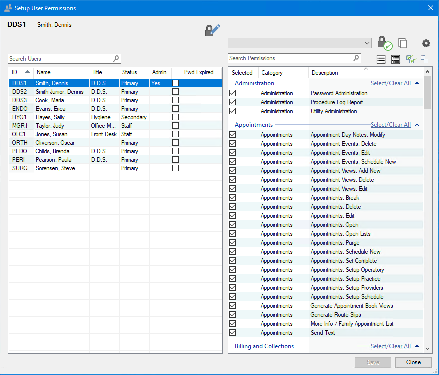 2. Select the user you want to grant the permission to, and then expand the Practice Setup category.