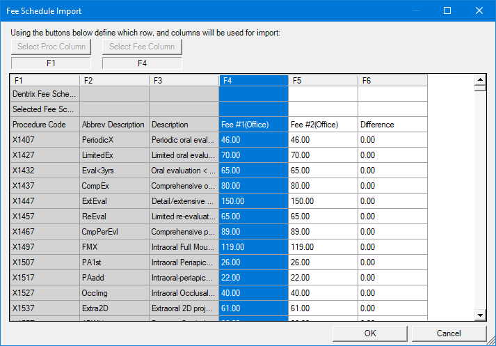 Note: If the file does not match the Dentrix Fee Schedule Export format, the Select Proc Column and the Select Fee Column buttons are enabled, so you can manually select the Proc and Fee columns for import.