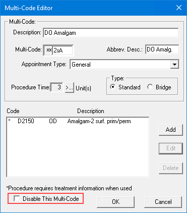 Dentrix allows you to disable any multi-code. Disabling a multi-code removes it from the Procedure Code List in the Procedure Codes dialog box in the Appointment Book and the Multi-Codes list in the Enter Procedure(s) dialog box in the Ledger but not from the Multi-Code Setup dialog box or the Dentrix database as deleting a multi-code would.