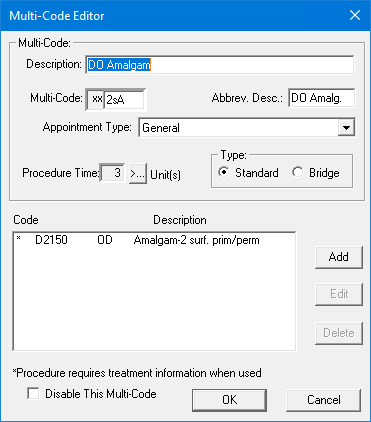 Note: You must assign a unique five-character code to each multi-code. Dentrix automatically assigns "xx" as the first two characters.