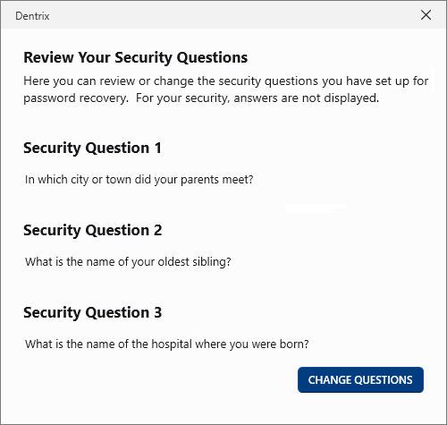 If you have previously set up your security questions, you can review them, but not your answers. If you want, you can change your questions.