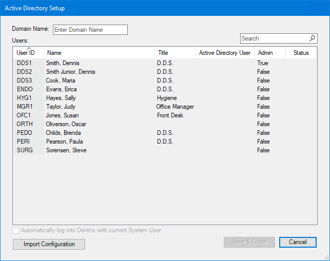 Active Directory is a directory service developed for Windows domain networks. If you enable Active Directory, you can reduce the number of user IDs and passwords your Dentrix users must remember by aligning their Dentrix accounts to their Microsoft network accounts, and then letting them log into Dentrix using their Microsoft network credentials. If you have up to 250 providers and 250 staff members, you can let users are logged into your network automatically access Dentrix without re-entering their network credentials.