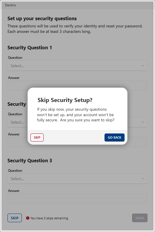 1. To close the warning and skip setting up your security questions, click Skip.