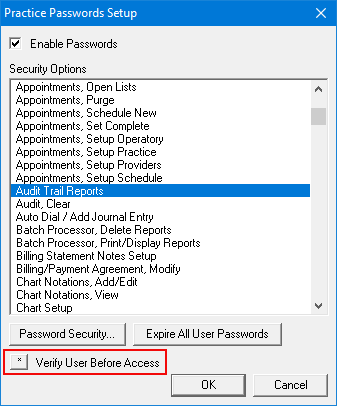 Besides assigning user rights, you can further enhance the security of your database by requiring users to re-enter their passwords before they open a Dentrix module or perform a specific task. For example, you could require users to re-enter their passwords before they could set up, open, create, delete, or print prescriptions. Before requiring users to re-enter their passwords, consider how frequently they need to perform some tasks, such as setting appointments. Interrupting routine tasks by having users re-enter their passwords would be time-consuming and could adversely affect your practice's efficiency.