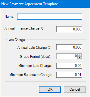 Minimum Balance to Charge - Type the minimum balance to assess a finance or late charge. The minimum balance is compared to the balance of each account with a payment agreement, and a finance or late charge is assessed only to those accounts having a balance greater than the minimum. The default minimum balance is $0.01. You can increase the default, but you cannot make the default less than $0.01.
