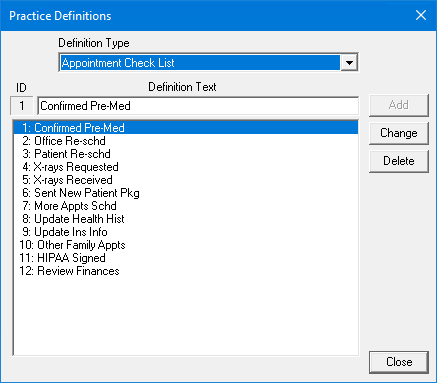 To change an appointment check list item, select the item that you want to change, type a new description, and then click Change. To learn more, click Changing practice definitions.