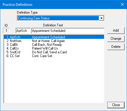 To change a continuing care status, select the status that you want to change, replace the abbreviation and description with new ones, and then click Change. To learn more, click Changing practice definitions.