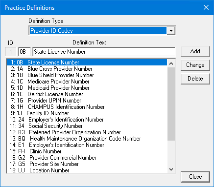 To change a provider ID code, select the code that you want to change, type a new description, and then Click Change. To learn more, click Changing practice definitionsn.