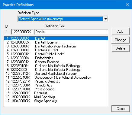 To change a referral specialty, select the specialty that you want to change, type a new description, and then click Change. To learn more, click Changing practice definitions.