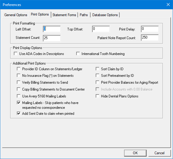 In the Print Options tab of the Preferences dialog box, you can set general printing options that will affect reports printed from Dentrix. These settings will not affect letters since they are printed from Microsoft Word.