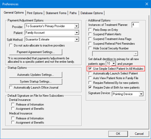 In previous versions of Dentrix, the simple Select Patient dialog box appeared by default when you wanted to select a patient. With Dentrix G5, Dentrix defaults to a more robust and feature rich Select Patient dialog box for all Dentrix modules. However, if you prefer using the simple Select Patient dialog box, you can change the default setting.