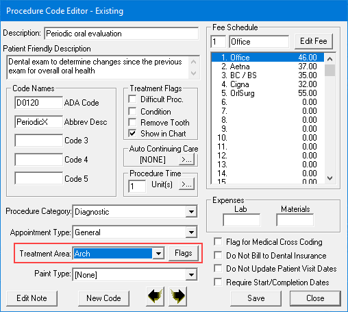 Each default procedure already includes the relevant flags. Changing the flags does not affect any previously entered or charted procedures for a patient. When you post work in the future, Dentrix changes the procedure codes automatically according to the options you selected in the Flags dialog boxes. You can suspend the treatment area flags by setting Dentrix preferences. To learn more, click the following links: