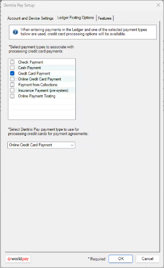 10. Select the payment types that you want to associate with processing credit card payments and the Dentrix Pay payment type to use for payment agreements, and then click OK.