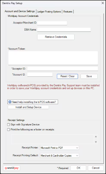 To use Dentrix Pay, you must have internet access, have a compatible payment device from Worldpay, and set up and activate a Worldpay merchant account. For details on how to set up a Worldpay account, contact Henry Schein One Sales at 1-800-366-8749 option 1, then option 2.