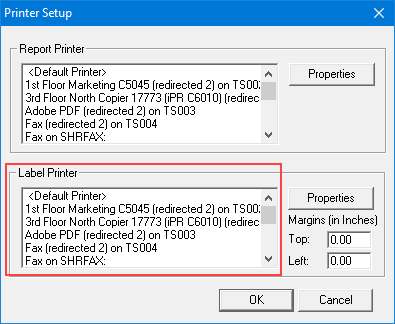 Important: If the printer that you want to print labels to does not appear in the Printer Setup dialog box, the printer may not be configured for Microsoft Windows. Contact your hardware support representative for assistance in installing and configuring the printers in your office.