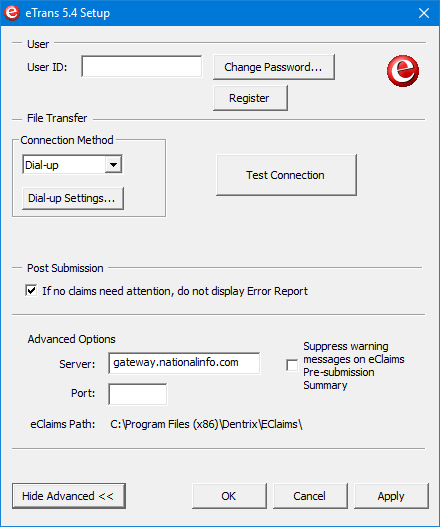 Once you have registered, you must set up eTrans and adjust a few Dentrix settings to accommodate the electronic claims submission process.