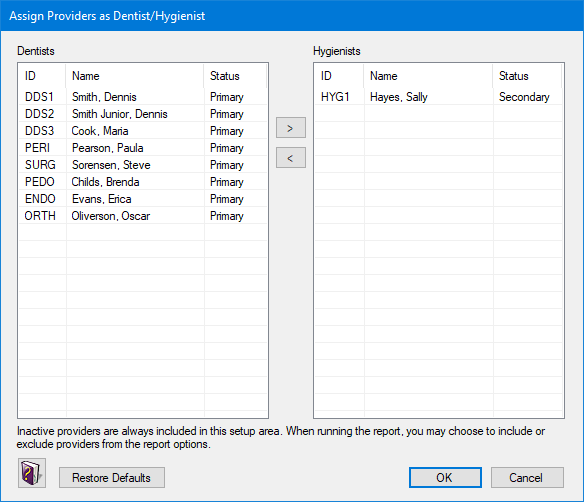 · To return providers with a "Primary" Status to the Dentists list and providers with a "Secondary" Status to the Hygienists list, click Restore Defaults.