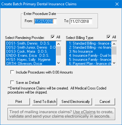 The Create Batch Primary Dental Insurance Claims dialog box appears.