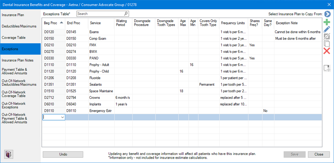 For services that are not covered by an insurance plan, you can use Dentrix to create an exceptions table to document and track the exceptions to in-network and out-of-network insurance plans.