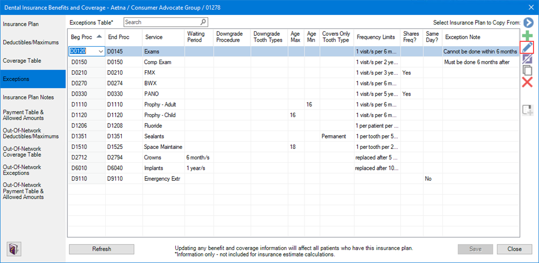For services that are not covered by an insurance plan, you can use Dentrix to create an exceptions table to document and track the exceptions to in-network and out-of-network insurance plans.