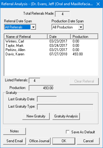 From the Office Manager, you can access the same referral analysis information available in the Family File. The Referral Analysis gives you very specific information about the amount of production and the total number of referrals made by a patient in user-defined referral and production time spans.