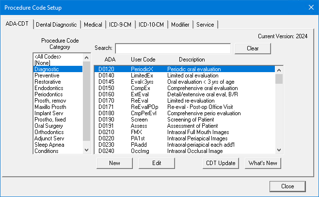 5. To complete the process for adding or editing ADA-CDT dental codes, click Adding ADA-CDT dental codes or Editing ADA-CDT dental codes, respectively.