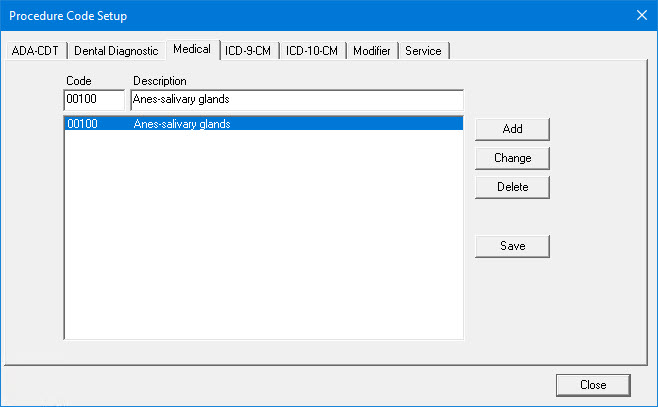 Note: Once you add the medical codes, you must link the ADA code with its AMA code counterpart. For more information, see Cross-coding ADA codes with AMA-CPT (medical) codes.