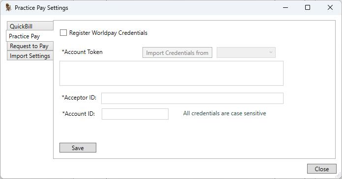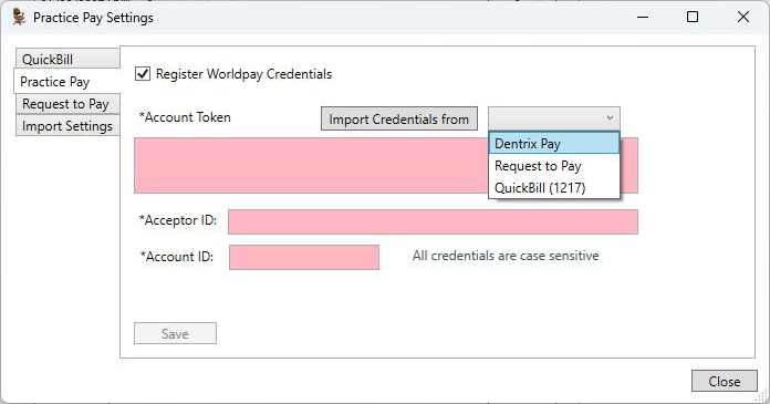 Click Import Credentials from, and then from the list, click Dentrix Pay, Request to Pay, or QuickBill.