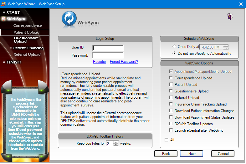 Running WebSync assimilates the information in your practice management software with that in your eCentral website. By running WebSync you can upload information to your eCentral website and import new online accounts, online information changes, and online payments into your practice management software. Running WebSync also sends the correspondence you have requested to your patients.