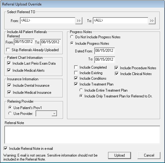 Include All Patient Referrals - Type a date range for referrals to include in the upload. To upload only those referrals that you have not uploaded previously, select Skip Referrals Already Uploaded.