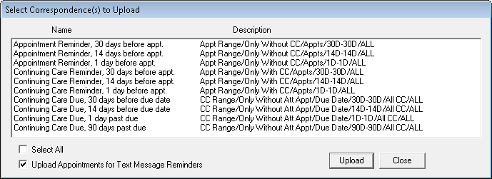 Clear Upload Appointments for Text Message Reminders to exclude appointments for text message reminders from the upload.