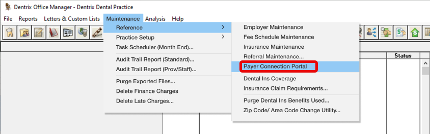 1. In the Office Manager, click Maintenance, point to Reference, and then click Payer Connection Portal.