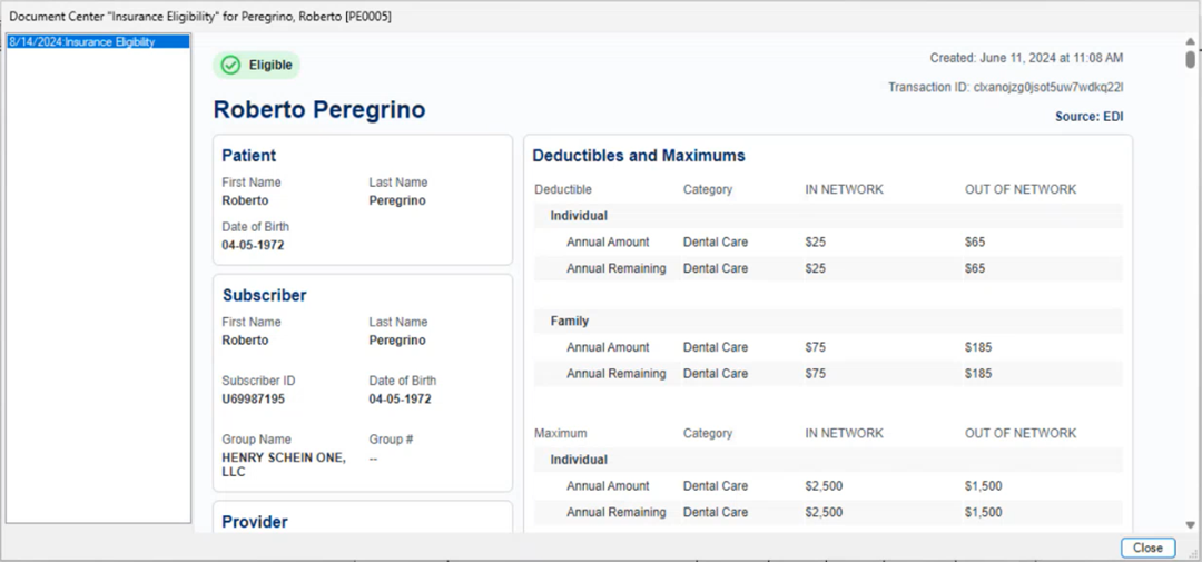 The Document Center opens displaying the insurance eligibility report for the selected patient.