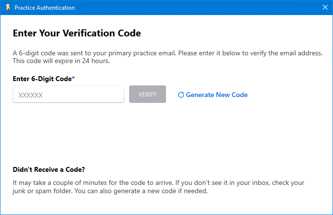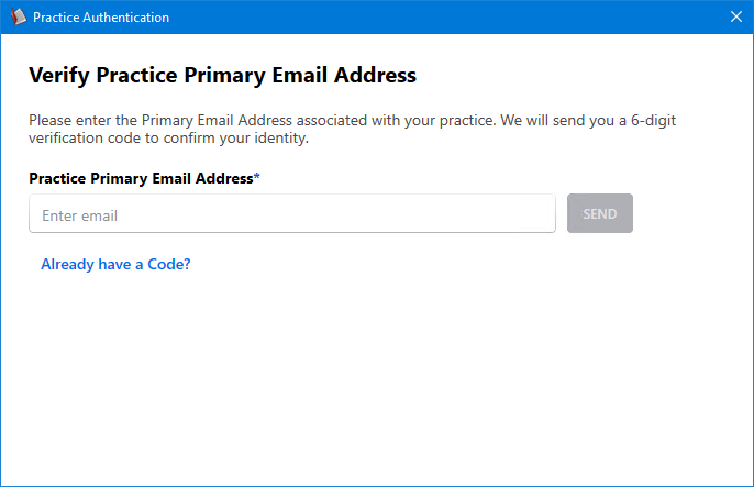 An email message containing a six-digit code is sent to you primary practice email account, and the Practice Authentication dialog box reappears.