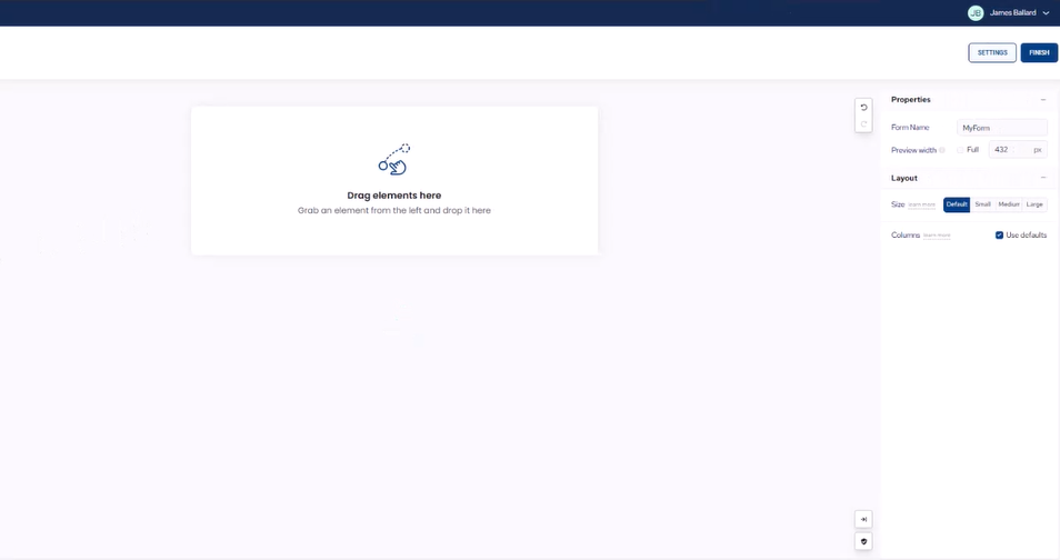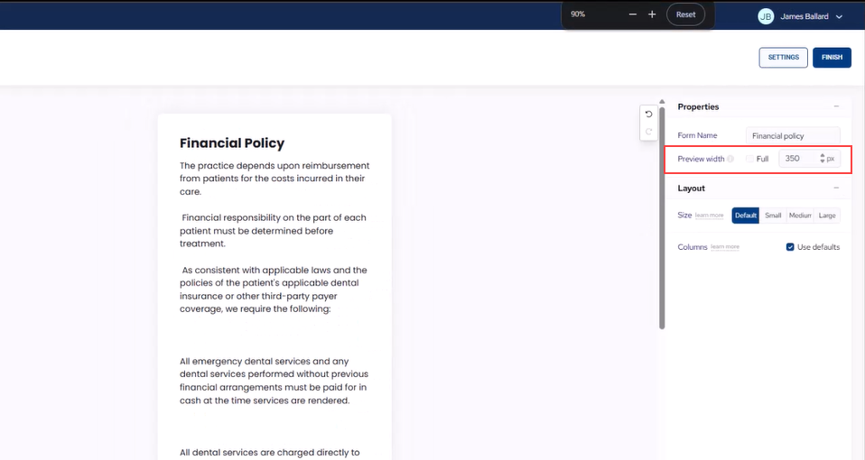 Note: The default view of the form is 650 pixels wide. The average width for mobile phones is 350 pixels. Adjust the Preview width accordingly. Or to view the form as might look on a laptop, select Full.