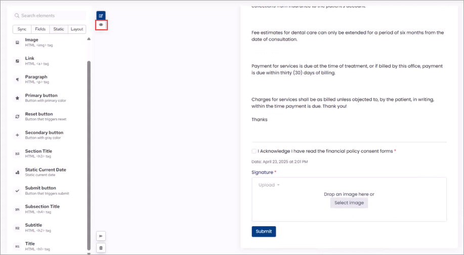 e. To add a Submit button to the form, click the Static tab, click Submit button, and than drag that element to the workspace below the Signature box.