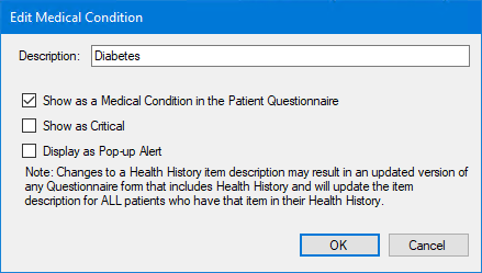 7. Select Show as a Medical Condition in the Patient Questionnaire, and then click OK.